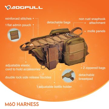 The Dogpull M60 is a durable, military-inspired dog harness featuring a MOLLE panel system for detachable bags and accessories. Built for comfort and versatility, it’s perfect for working dogs, training, hiking, or everyday adventures.