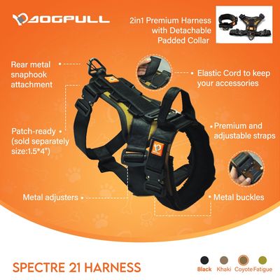 The Dogpull Spec 21 is a 2-in-1 dog harness designed for strength, flexibility, and control. Its detachable collar gives you the option to use it as a full harness or collar-only setup, depending on your needs. Built with heavy-duty metal buckles and adjusters, the Spec 21 delivers maximum durability and a secure fit for active dogs.